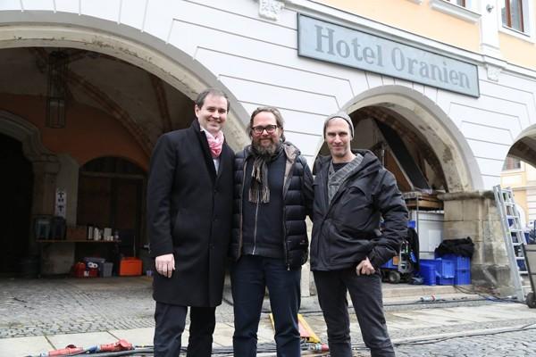 • Markus Görsch (MDM), Robert Schwentke und Frieder Schlaich am Set in Görlitz