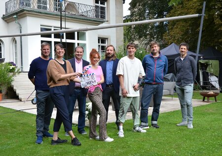 Auf dem Bild: Dietmar Güntsche (Neue Bioskop Film/Weltkino Filmverleih), Regisseurin Teresa Hoerl, Markus Görsch (MDM), Hauptdarstellerin Lina Larissa Strahl, Martin Rohé (Neue Bioskop Film), Darsteller Gustav Schmidt, Kameramann Fabian Rösler, Herstellungsleiter Max Frauenknecht (Via Film) (v.l.n.r.)